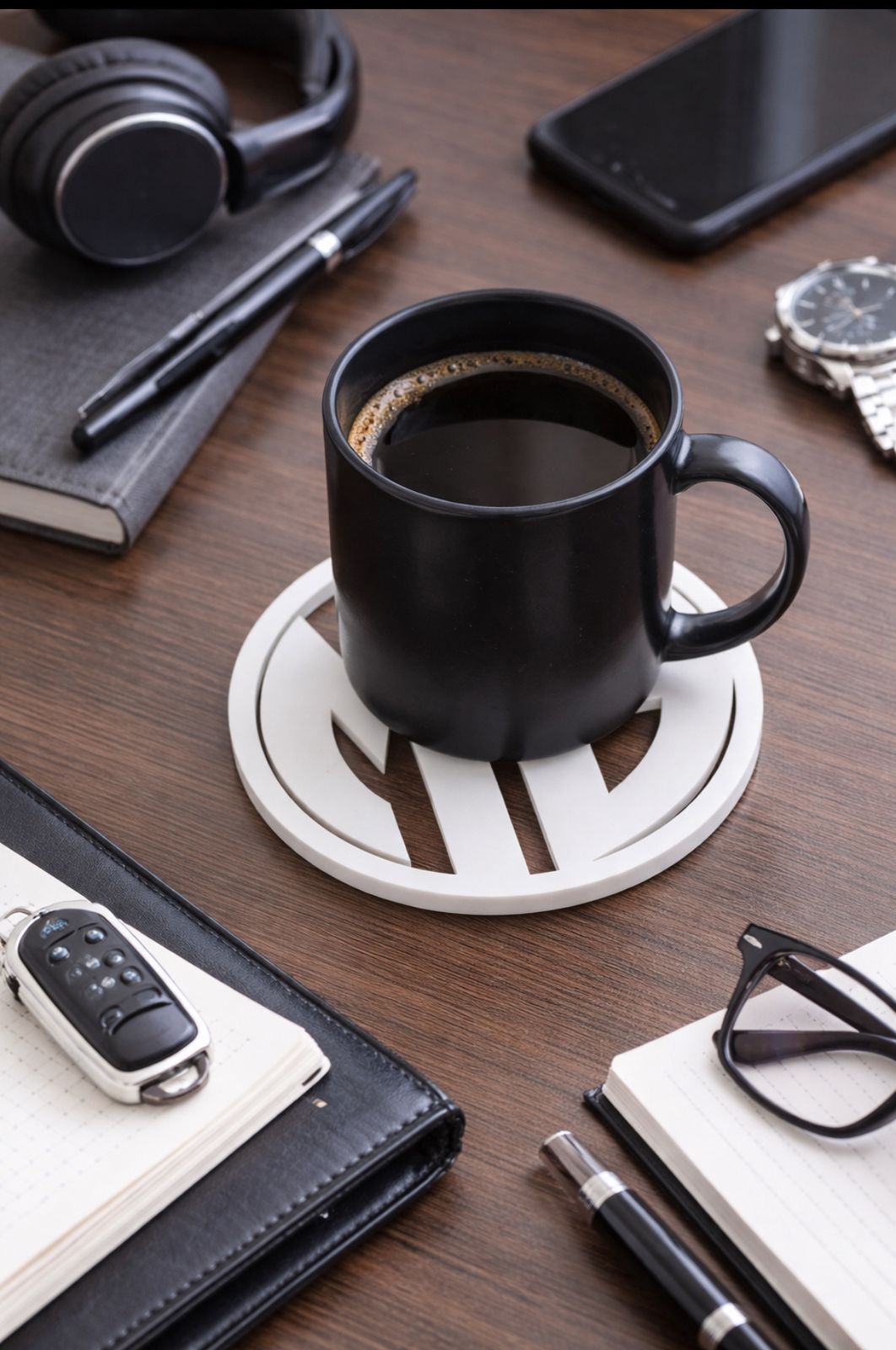 This piece is both decorative and functional, protecting surfaces from hot or cold drinks while adding a subtle custom touch to any space.